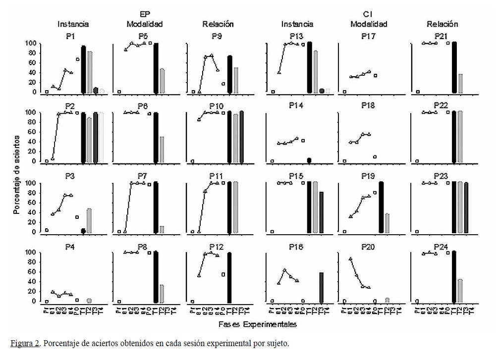 Si se observa nuevamente la figura 2 se notará que los participantes que tuvieron altos porcentajes de aciertos en la última sesión de entrenamiento mantuvieron un porcentaje de aciertos similar en la posprueba y en la transferencia extrainstancial (T1). De los 17 participantes que mantuvieron un porcentaje de aciertos cercano al 100% en T1, sólo 8 lograron un porcentaje de aciertos similar en la prueba de transferencia extramodal (T2) (P1, P2, P10, P11, P13, P15, P22 y P23). En la prueba de transferencia extrarelacional (T3) sólo cuatro participantes obtuvieron altos porcentajes de aciertos (P2, P10, P15 y P23); mientras que en la última prueba de transferencia (extradimensional-T4) sólo el participante P2 tuvo un desempeño efectivo. Observando los resultados encontrados en la fase de transferencia por cada grupo, se destaca que el peor desempeño en dicha fase fue el de los participantes del Grupo 2 (EP-modalidad) y del Grupo 5 (CI-modalidad), y que los mejores resultados fueron obtenidos por un participante del Grupo 1 (EP-instancia), después de alcanzar porcentajes de aciertos cercanos al 100% en todas las pruebas de transferencia.