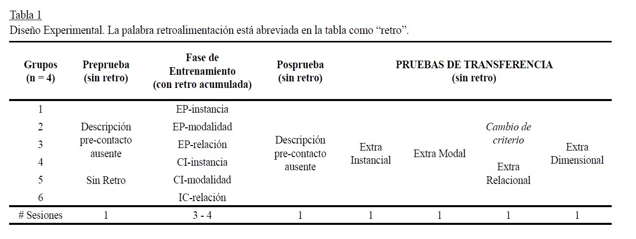 Se utilizó un diseño factorial 3 X 2 (contenido de descripción X tipo de descripción) con lo cual se formaron seis grupos de participantes. Las variables que se manipularon fueron la referencia de propiedades instanciales, modales y relacionales de los estímulos en las descripciones específicas y pertinentes (EP) y en las descripciones de respuestas correctas e incorrectas (CI). Los grupos que resultaron de dicha combinación fueron el Grupo EP-instancia (Grupo 1), el Grupo EP-modalidad (Grupo 2), el Grupo EP-relación (Grupo 3), el Grupo CI-instancia (Grupo 4), CI-modalidad (Grupo 5) y CI-relación (Grupo 6). Todos los grupos enfrentaron una sesión de preprueba, una de posprueba, así como sesiones de pruebas de transferencia extrainstancial, extramodal, extrarelacional y extradimensional (de acuerdo a la matriz de transferencias propuesta por Varela & Quintana, 1995); mientras que en el entrenamiento podían enfrentar de tres o cuatro sesiones (véase Tabla 1).