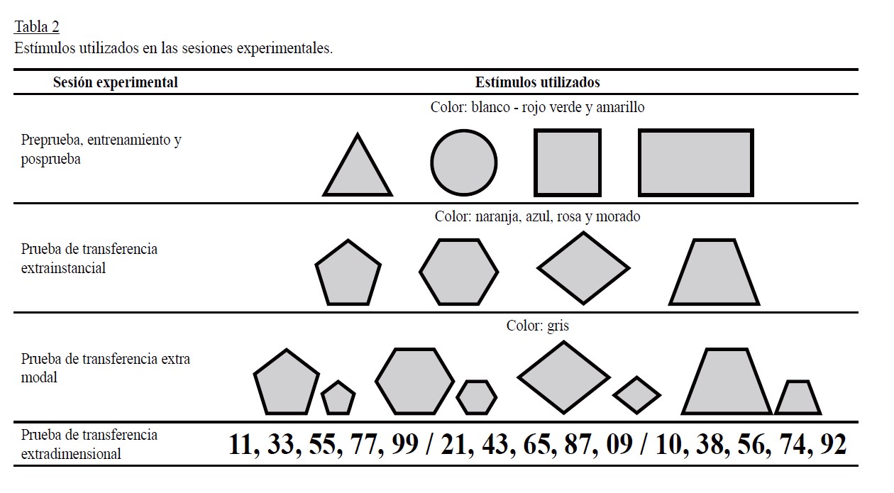 Las figuras empleadas en las sesiones de preprueba, entrenamiento y posprueba fueron cuadros, triángulos, rectángulos y círculos de color blanco, rojo, verde y amarillo. En la prueba de transferencia extrainstancial se utilizaron pentágonos, hexágonos, rombos y trapecios de color naranja, azul, rosa y morado; en la prueba de transferencia extramodal se utilizaron las mismas figuras que en la prueba anterior, cambiando los tamaños de las figuras (chicas y grandes) y manteniendo un mismo color para todos los estímulos (gris). En la prueba de transferencia extrarelacional se utilizaron las mismas figuras que en la anterior prueba; sólo cambió el criterio de igualación a diferencia o identidad. Por último, en la transferencia extradimensional los estímulos fueron números de dos cifras, donde los Eco's se podían igualar indistintamente por decenas o unidades con respecto al EM; el criterio de igualación que se consideró correcto fue el de diferencia o identidad, dependiendo del criterio seleccionado por el participante en la prueba extrarelacional (véase tabla 2). El arreglo y el tipo de estímulos utilizados en cada sesión fue el mismo para todos los grupos experimentales (véase figura 1).