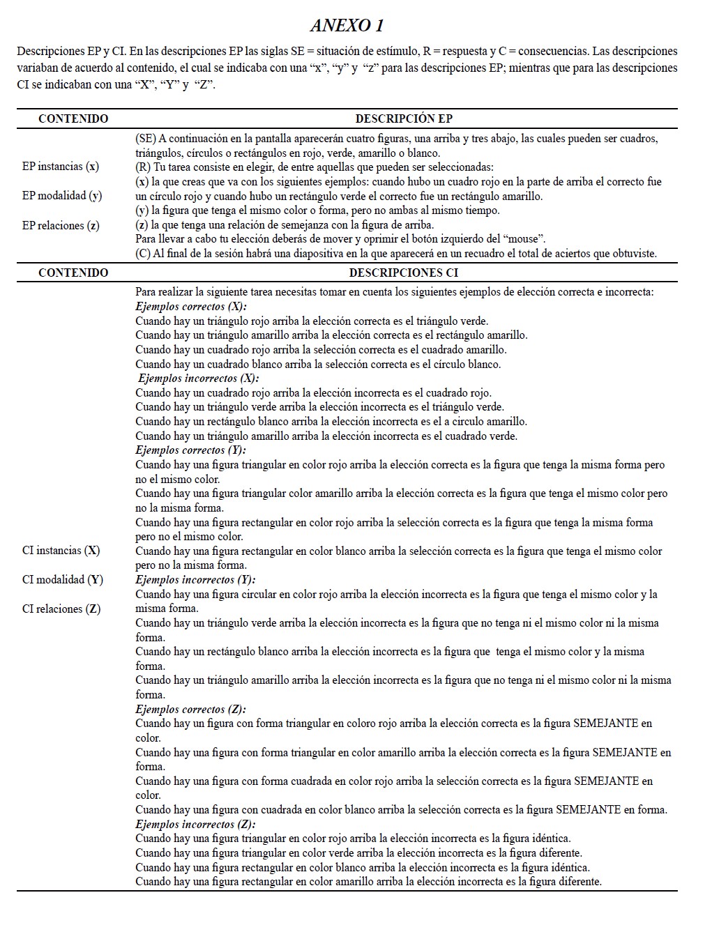 En otras investigaciones se ha asumido que en las pruebas de transferencia se puede evaluar comportamiento intrasituacional (selector), extrasituacional (sustitutivo referencial) y transituacional (sustitutivo no referencial) (e.g., Ribes, Ontiveros, Carvajal, Martínez & Vargas, 2005; Ribes & Serrano, 2006), tal como lo propuso Ribes (1990). En este sentido se ha asumido que las descripciones que se refieren a las propiedades instanciales (i.e., triángulo rojo con círculo rojo), modales (i.e., selecciona con el mismo color pero con otra forma) y relacionales (i.e., selecciona el diferente) de los estímulos tienen funcionalidad intrasituacional, extrasituacional y transituacional, respectivamente (e.g., Carpio, Pacheco, Carranza, Flores & Canales, 2003; Irigoyen, Carpio, Jiménez, Silva & Acuña, 2002; Serrano, García & López, 2006; Serrano, García & López, 2008; Serrano, García & López, 2010; Villanueva, Mateos & Flores, 2008). Bajo esta lógica se espera que a mayor nivel de funcionalidad en las descripciones mejor desempeño en las pruebas de transferencia. Sin embargo, en algunos casos las ejecuciones de los participantes expuestos a dicho tipo de descripciones no han mostrado correspondencia con el tipo de complejidad conductual esperado (e.g., Irigoyen et al., 2002; Serrano, García & López, 2010).