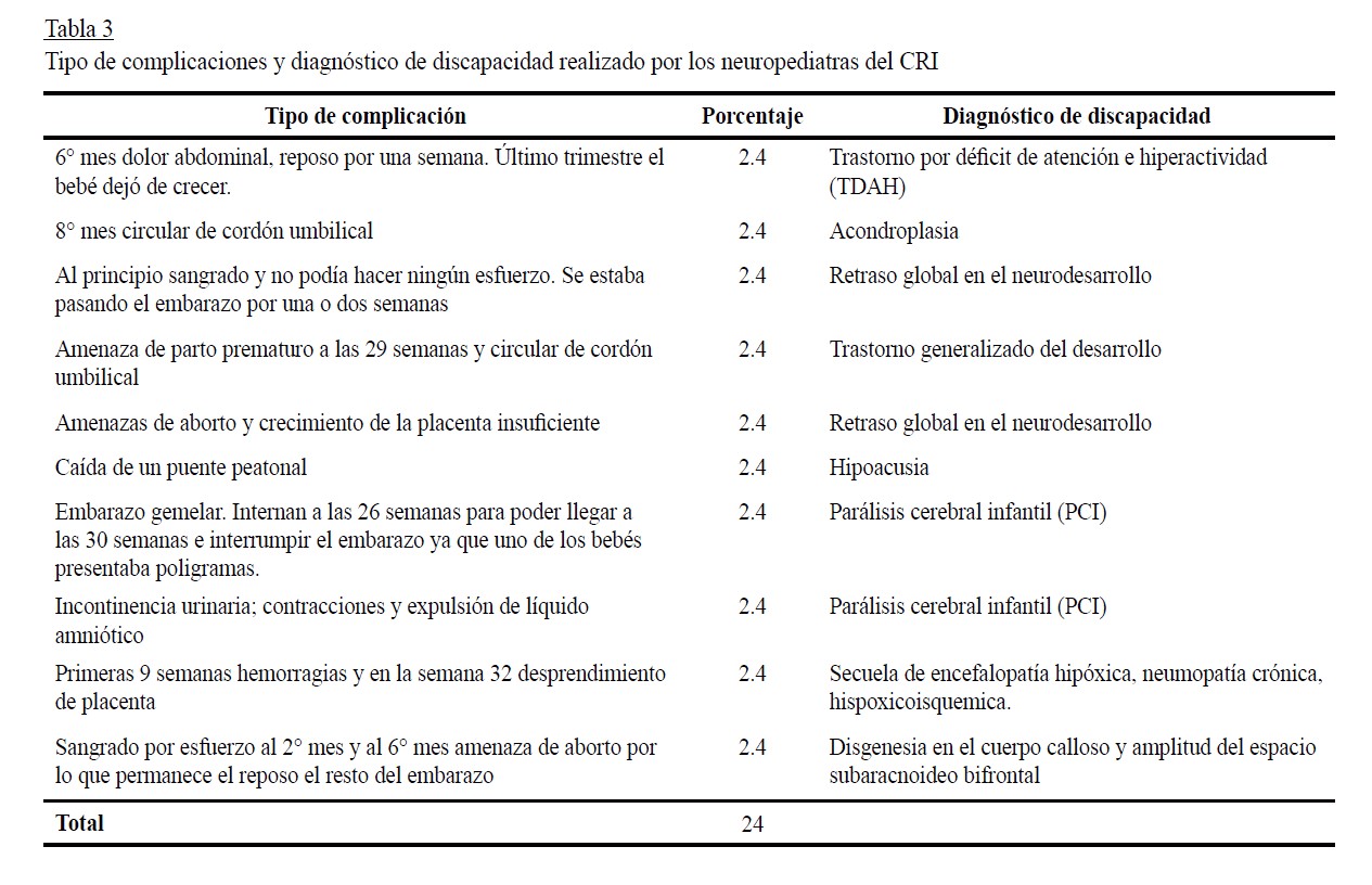 Conocimiento de la discapacidad. Respecto a los antecedentes prenatales, es importante conocer si las madres identifican alguna etiología de la discapacidad de sus hijos, por lo que se exploró si durante el embarazo hubo algún riesgo que pudiera ser el motivo de la discapacidad del menor. A continuación se presentan los resultados: Sólo en diez de los casos (24%) se presentaron complicaciones, las cuales conjuntamente con el tipo de discapacidad del menor se muestran en la Tabla 3.
