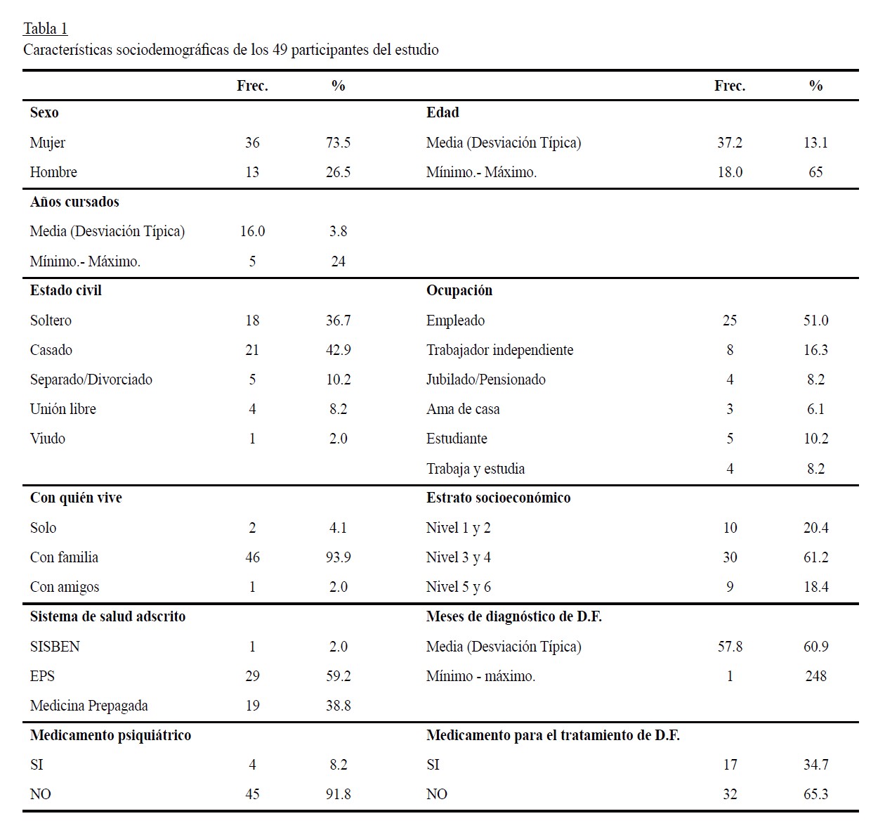 En la tabla 1 se aprecia que la gran mayoría de los participantes de este estudio fueron mujeres (73.5%), con un nivel de educación universitario, casadas (42.9%), empleadas (51.0%) que vivían en compañía de sus familiares (93.9%), de estrato socioeconómico medio (61.2%), inscritos a una Entidad Prestadora de Servicios de Salud -EPS (59.2%), con 57 meses de diagnóstico de enfermedad, es decir, con cuatro años y ocho meses de diagnóstico de dispepsia funcional. La mayoría no consumía medicamentos psiquiátricos (91.8%) ni medicamentos para la dispepsia funcional (65.3%); sin embargo, un 34.7% estaba en tratamiento médico específico para la enfermedad.