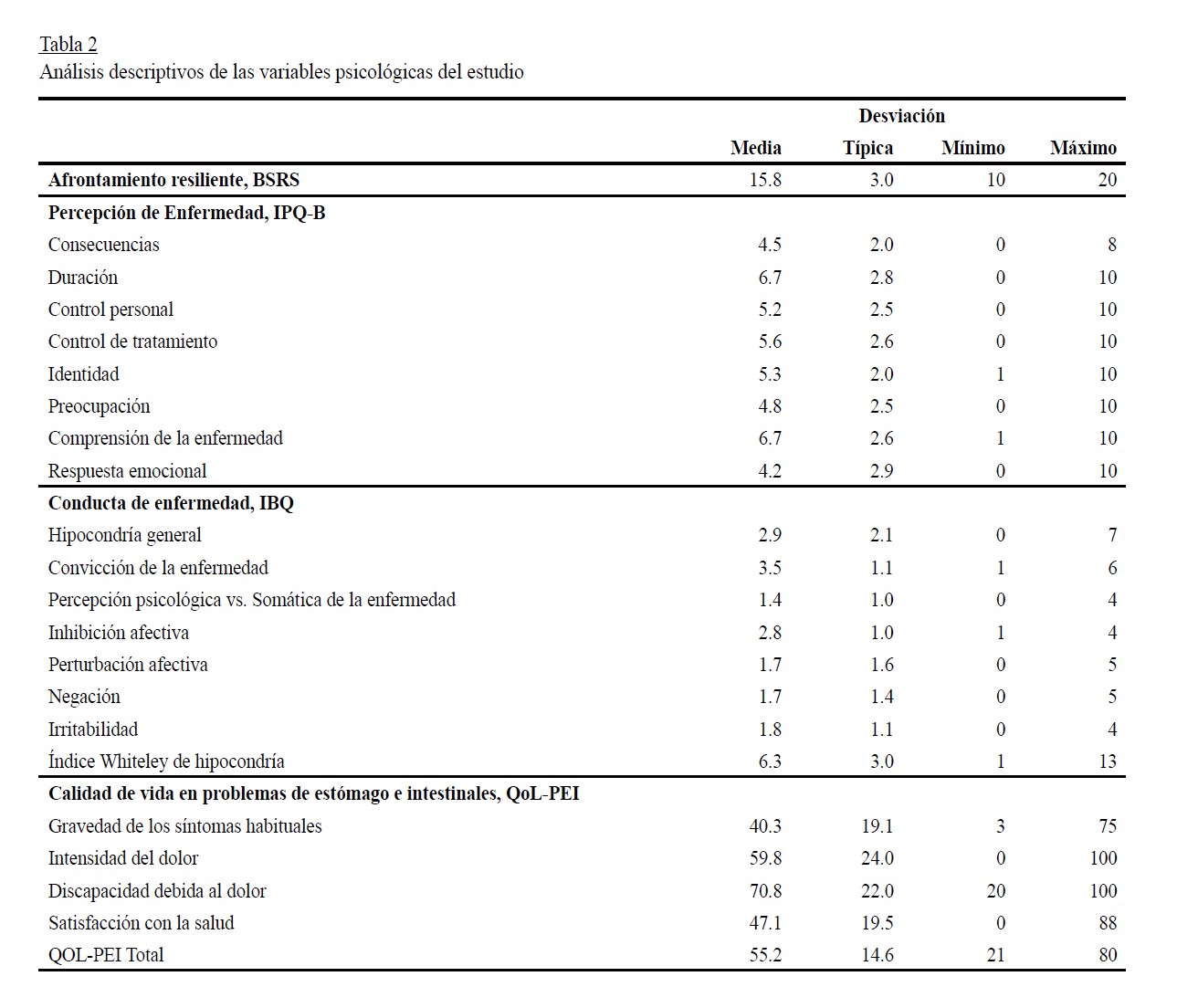 Los instrumentos utilizados en este estudio no son validados en el contexto colombiano, se cuenta solamente con algunas caracterizaciones con el cuestionario IPQ-B de percepción de enfermedad (Vinaccia, Quiceno y Remor, 2012), la escala de conducta de enfermedad (Vinaccia, Bustamante, Sánchez, Tobón y Cano, 2006) y el QoL-PEI de calidad de vida en dispepsia funcional (Cano et al., 2006). En cuanto a la escala de afrontamiento resiliente BSRS, se le realizó el proceso de traducción retrotraducción y adaptación cultural para aplicarla en este estudio.