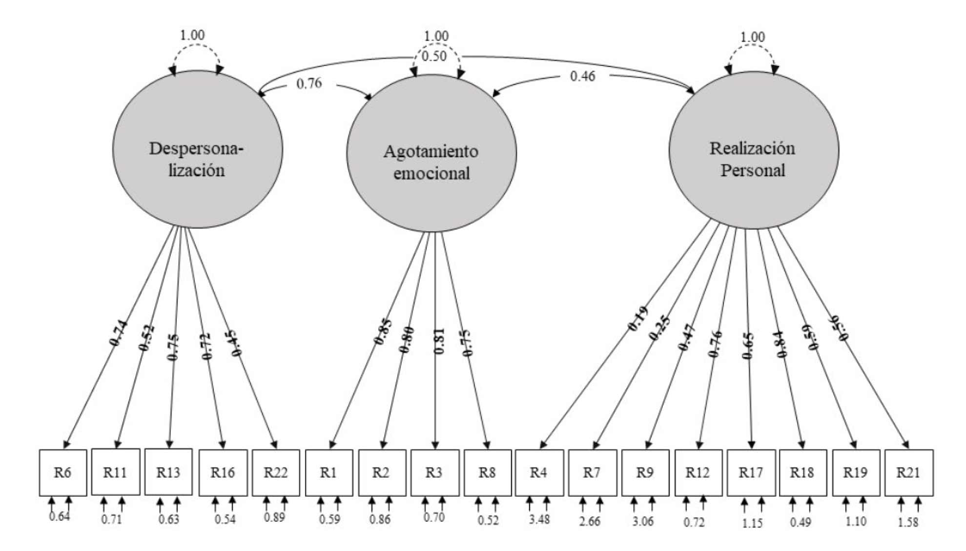 Finalmente, en el estudio de Meda et al. (2008), que se llevó a cabo con psicólogos mexicanos, se utilizó el AFE y el AFC, pero ambos procedimientos fueron aplicados a la misma muestra, y los autores obtuvieron una estructura de tres factores correlacionados con ajuste adecuado a los datos, en la cual no tuvieron que eliminar ningún reactivo. Aunque el método de extracción utilizado en dicho estudio no se considera adecuado de acuerdo con los criterios psicométricos vigentes (Watkins, 2020), la estructura que obtuvieron tiene similitudes con la obtenida en el presente trabajo: la escala de realización personal consta de los mismos reactivos que en nuestro caso, pero en nuestro estudio la subescala de agotamiento emocional obtenida incluye los reactivos 1, 2, 3 y 8, y no los reactivos 13, 14, 16 y 20 que sí incluye el trabajo de Meda et al. (2008); además, en la subescala de despersonalización es donde se encuentran mayores diferencias, pues solo coinciden los reactivos 11 y 22—los tres reactivos restantes son diferentes en ambas estructuras—.
