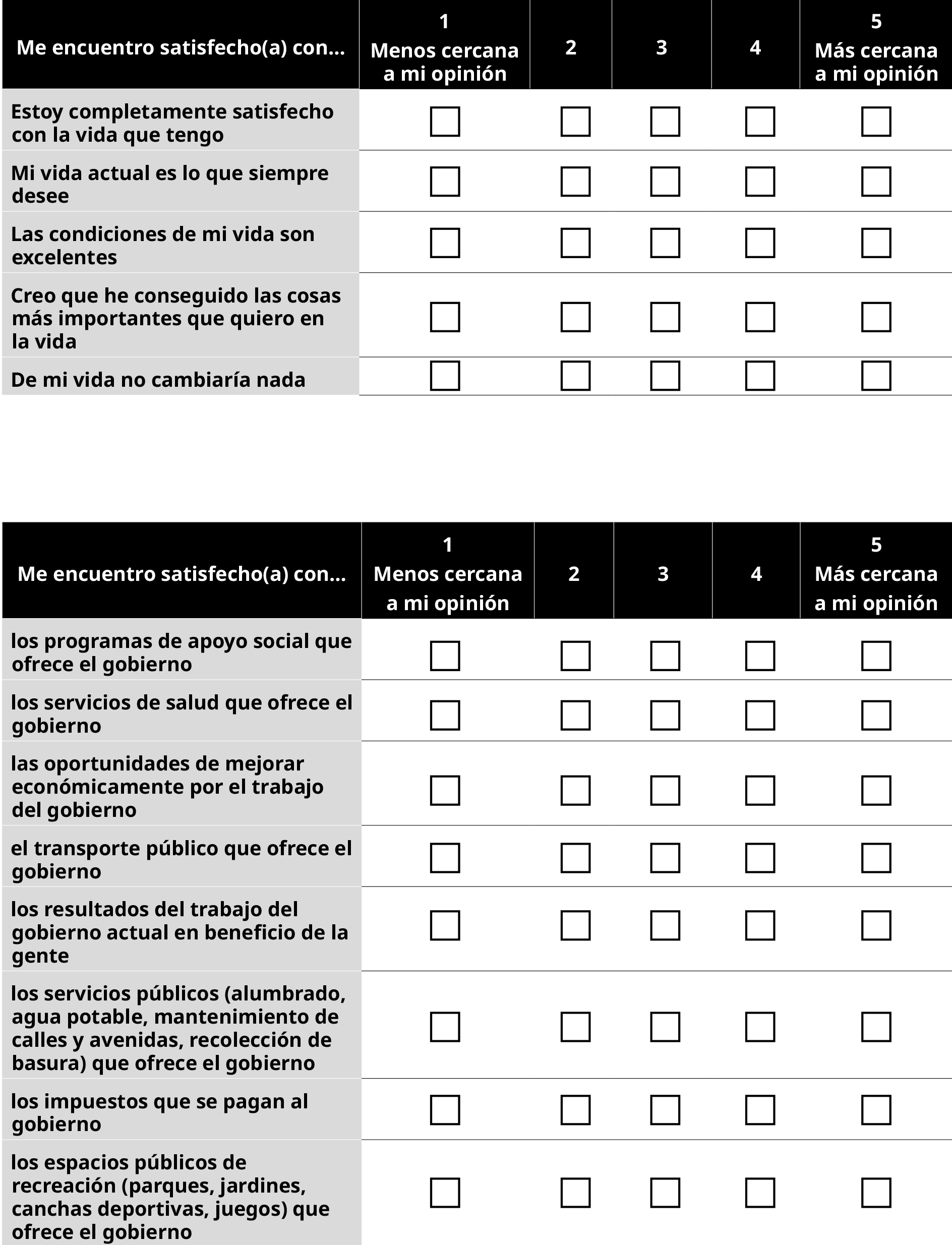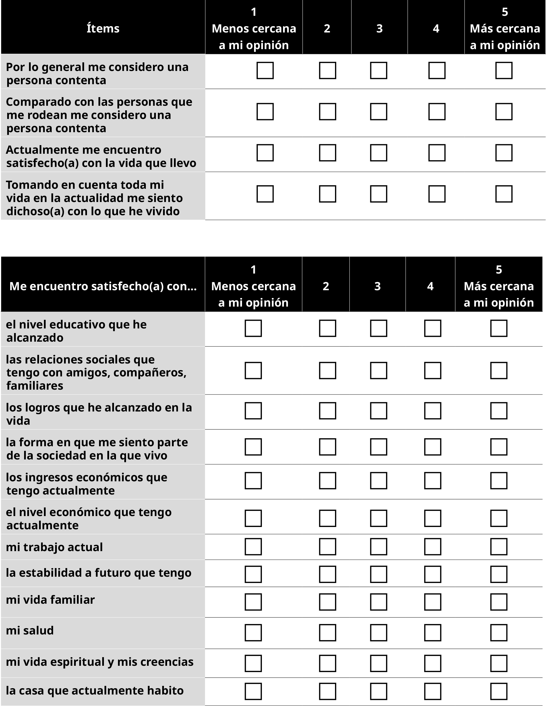A continuación, se le presentan una serie de afirmaciones sobre la satisfacción y las condiciones de vida en que se desenvuelve. Marque la opción que más se acerque a su punto de vista. Las opciones de respuesta se presentan en una escala del 1 al 5, donde 1 es el valor que menos se acerca a su punto de vista y 5 el valor que más se acerca.