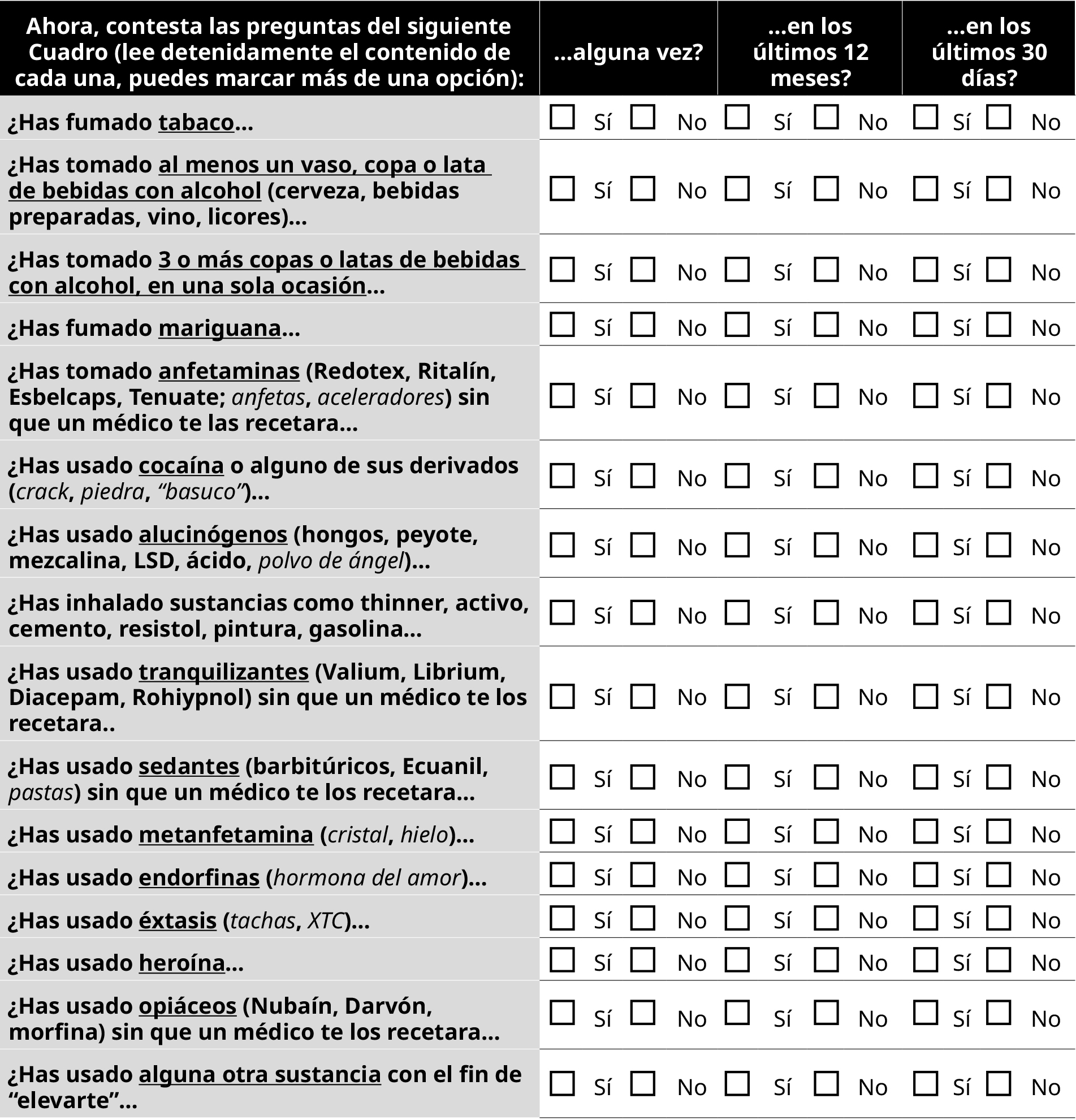Y por último, en cuanto al bloque de reactivos que exploran el consumo de sustancias psicoactivas, se indagó sobre el consumo alguna vez en la vida de alcohol, tabaco, mariguana, cocaína, inhalables, anfetaminas, tranquilizantes, entre otras, de forma dicotómica (1 = sí ha consumido y 0 = no ha consumido; véase Anexo 1). Dicho bloque toma como base el cuadro de exploración de sustancias psicoactivas del formato utilizado por el Sistema de Información Epidemiológica del Consumo de Drogas (CIECD) de los Centros de Integración Juvenil (CIJ, 2024).
