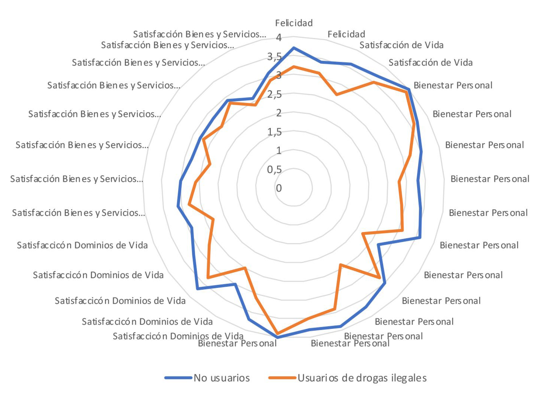 En particular, en el presente estudio sobresale que quienes usaron drogas presentaron menor bienestar subjetivo en los indicadores relacionados con la felicidad y la satisfacción con la vida, la satisfacción con los dominios de vida y el bienestar personal económico. Los dos primeros elementos están directamente asociados con la apreciación individual de la propia vida, lo cual puede figurar como factor de riesgo para el consumo en quienes muestran niveles bajos de satisfacción.