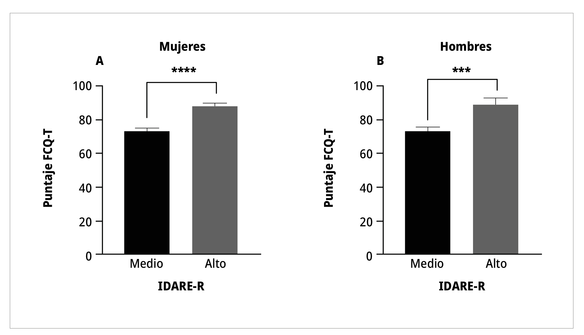 Nota. Se muestran los puntajes de FCQ-T tanto en los niveles medio como alto de IDARE en mujeres (A) y en hombres (B).