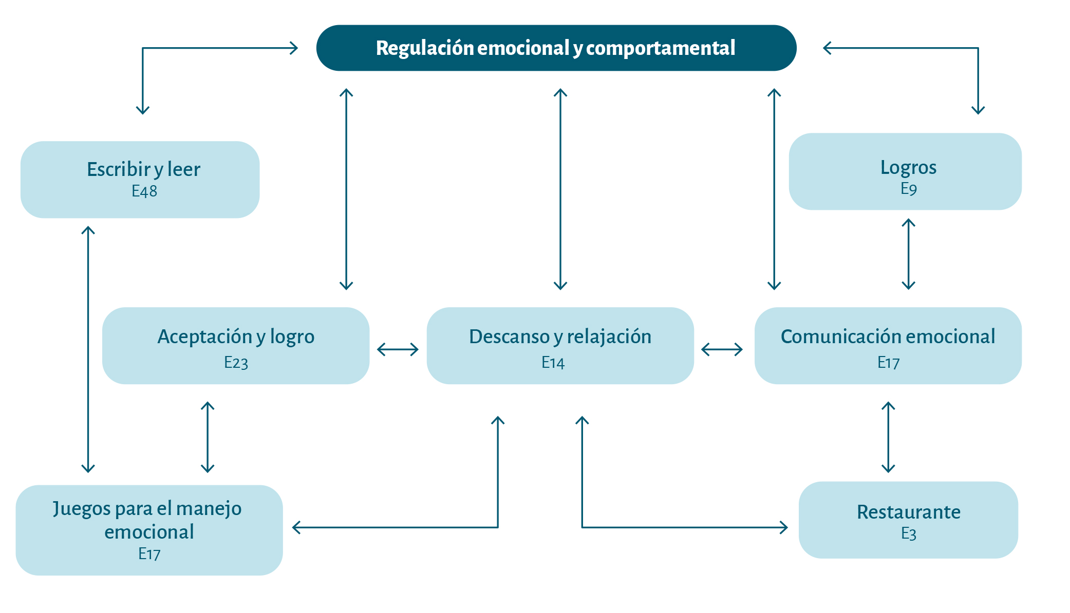 En cuanto a la subcategoría regulación emocional y comportamental, que se relaciona con las habilidades para la vida descritas previamente, es de resaltar que hace referencia a la destreza que implica reconocer emociones en sí mismo y en los demás, así como ser conscientes de cómo estas influyen en el comportamiento y la capacidad de responder a ellas apropiadamente (Mangrulkar et al., 2001; Mantilla & Chain, 2006). En este punto, es importante destacar el papel de esta habilidad en la expresión emocional a través de la escritura, el descanso y la relajación, así como en los juegos, los logros y el restaurante (véase Figura 3).