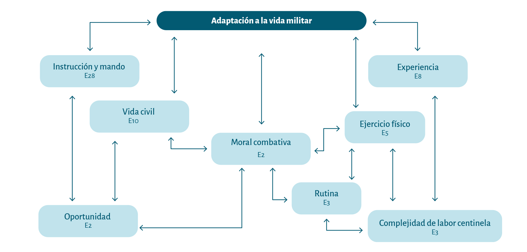 Finalmente, la subcategoría adaptación a la vida militar presentó una alta densidad, ya que contiene ocho códigos, y es entendida como el proceso en el cual se genera una modificación en el comportamiento para ajustarse a las normas militares; específicamente, el enraizamiento más grande se presenta en instrucción y mando, con 28 afirmaciones, que se relaciona con códigos como vida civil, complejidad de la labor de centinela, ejercicio físico, experiencia, oportunidades, rutina, y moral combativa (véase Figuras).