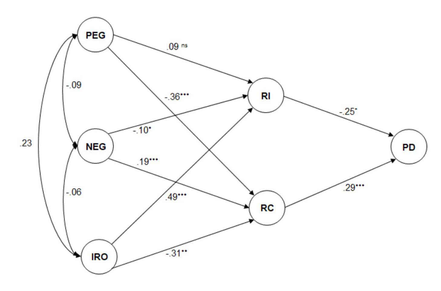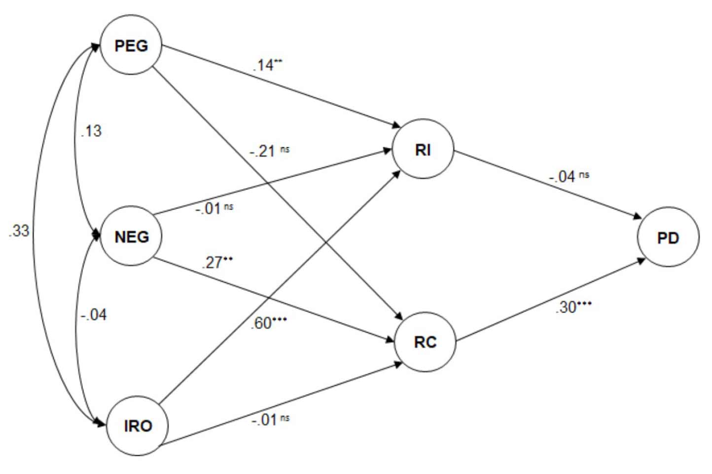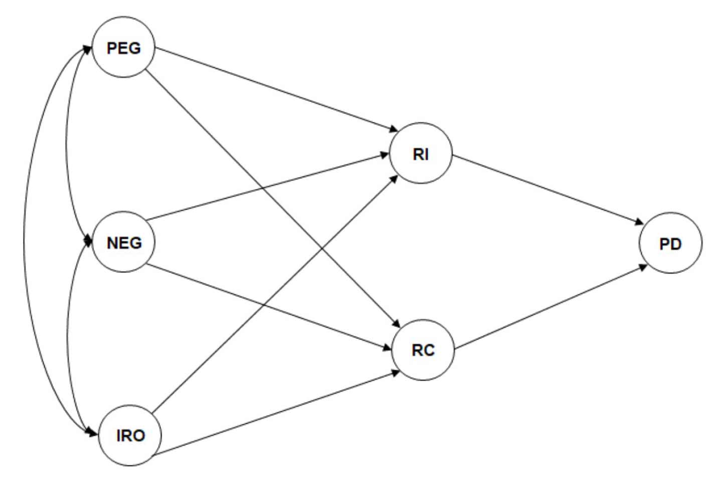 The study's analysis model was based on six observed variables: IRO, NEG, PEG, RC, RI, and PD, as well as nine direct path coefficients. Each observed variable has its own error variance, and 15 covariances among the exogenous variables (IRO, NEG, PEG) are estimated. In total, this yields 30 free parameters. According to the rule of thumb of10 participants per parameter (Schreiber et al., 2006), a minimum sample size of 300 participants was suggested. In addition, Kline (2005) recommends a sample size of at least 100 cases per group for multigroup modeling.