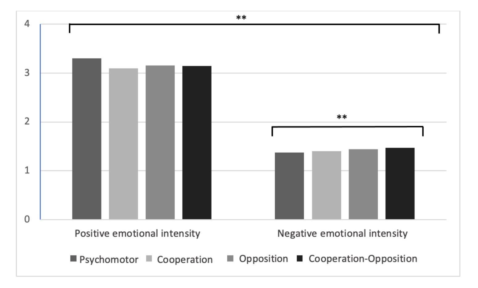 Regarding negative emotions, significant differences (p = .00) were found across the domains. The cooperative-oppositional domain obtained a higher negative emotional rating M = 1.47, SD = .68), followed by the oppositional (M = 1.44, SD = .65), the cooperative (M = 1.40, SD = .64), and the psychomotor (M = 1.37, SD = .65) domains (see Figure 1).