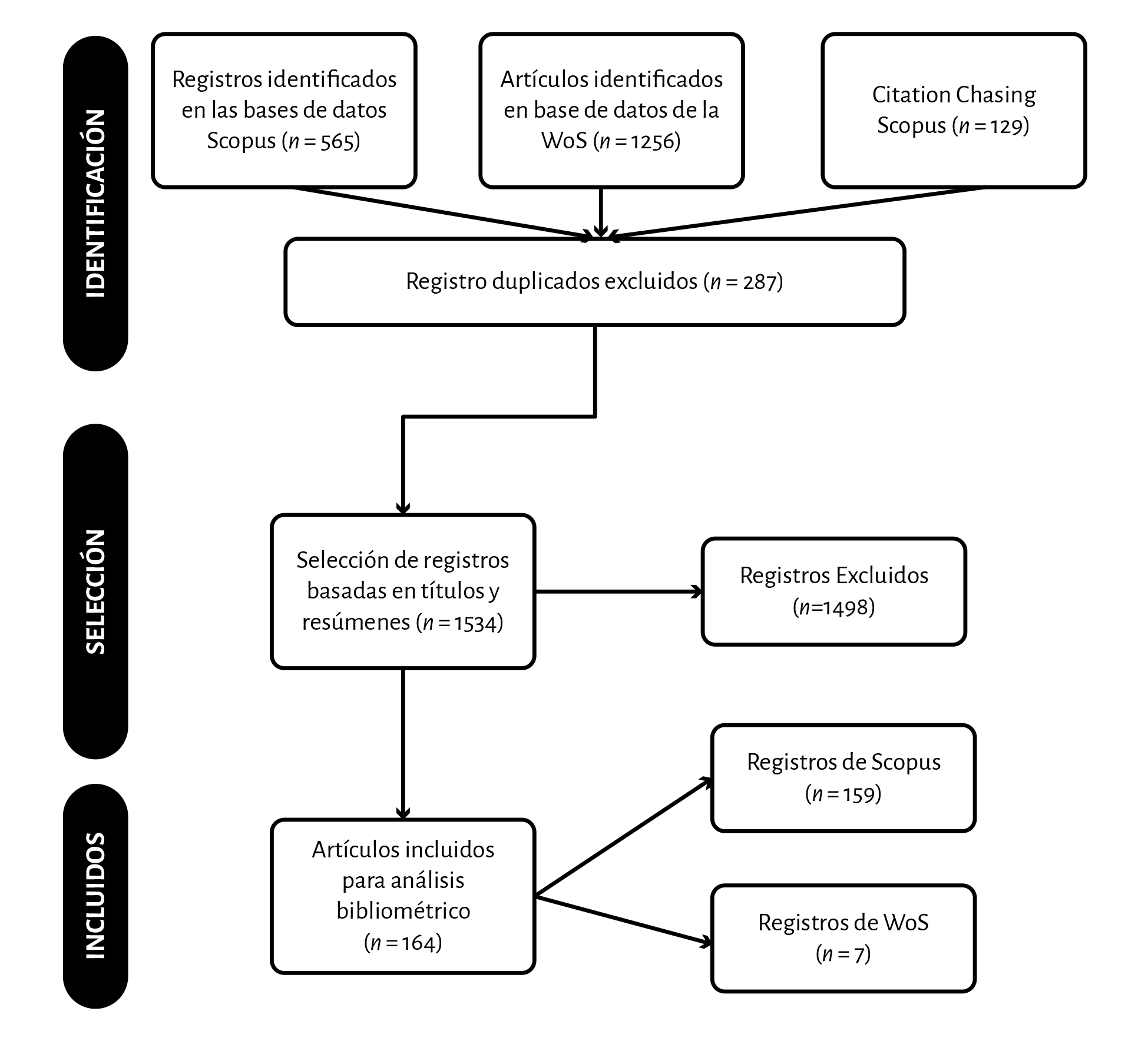 En total, la búsqueda en las bases de datos arrojó 1821 documentos asociados. Sin embargo, al revisar el título, resumen y palabras clave, varios artículos fueron descartados por no informar procesos de intervención en los campos de búsqueda definidos, razón por la cual se recurrió a la estrategia de búsqueda de artículos citantes —hacia adelante— y referencias —hacia atrás— de los artículos identificados en la búsqueda. Finalmente, se incluyeron 164 artículos para ser procesados en el análisis bibliométrico. Los detalles de la inclusión y exclusión de artículos se informan en el diagrama del proceso de selección (véase Figura 1).