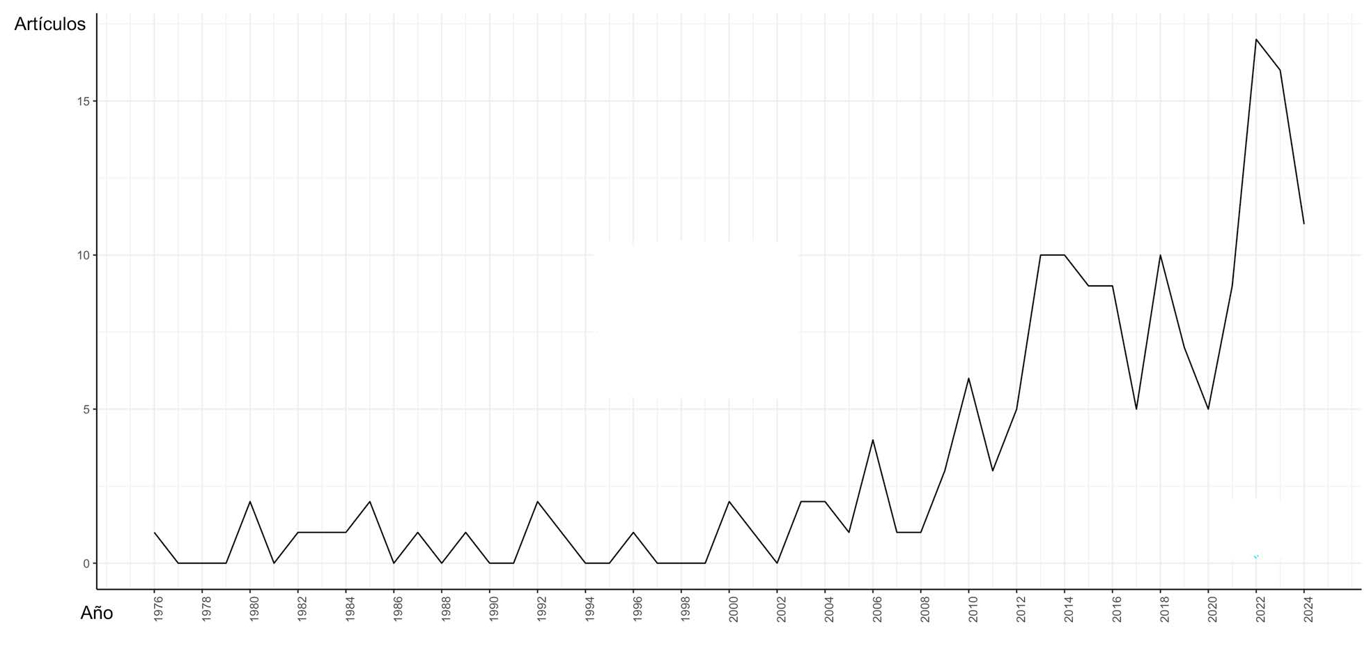 Nota. Crecimiento anual de documentos en la literatura relacionada con el fomento de comportamientos urbanos responsables en campus universitarios (1976-2024).