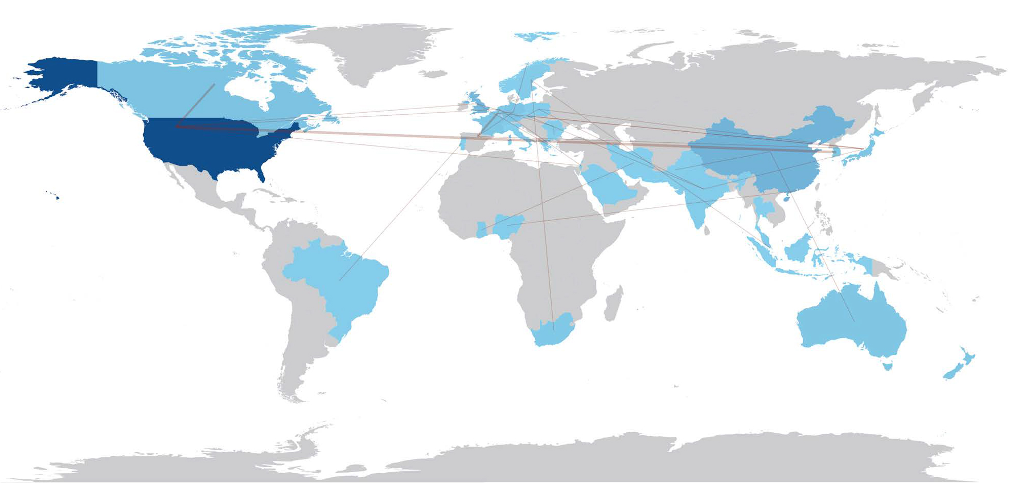De igual manera, Estados Unidos se posiciona como el país con el mayor número de colaboraciones en múltiples países, donde destaca especialmente el trabajo colaborativo con Corea y Canadá (tres y dos artículos, respectivamente). Además, se evidencia una colaboración, con un artículo con cada uno, con Israel, Países Bajos y Reino Unido.