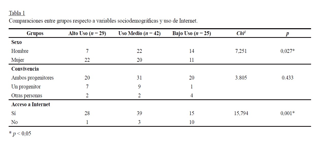 Respecto a las variables de tipo demográfico y social, se encontraron diferencias significativas en la distribución de ambos sexos entre los grupos, tal y como muestra la Tabla 1. Los datos indican que mientras en el grupo de Alto Uso de las redes sociales había más mujeres que hombres, ocurría lo opuesto en el grupo de Bajo Uso. De los 96 adolescentes, 71 viven con ambos progenitores, 17 con uno de ellos, y 8 con otras personas, sin que se encontraran diferencias significativas entre grupos. Sí hubo diferencias, sin embargo, respecto al acceso a Internet, ya que en los grupos de Alto y Medio Uso de redes sociales, sólo cuatro participantes no tenían Internet en casa, mientras que la cifra se elevaba a diez en el grupo de Bajo Uso. No se encontraron diferencias significativas entre los grupos, en relación con la distribución por estrato social.