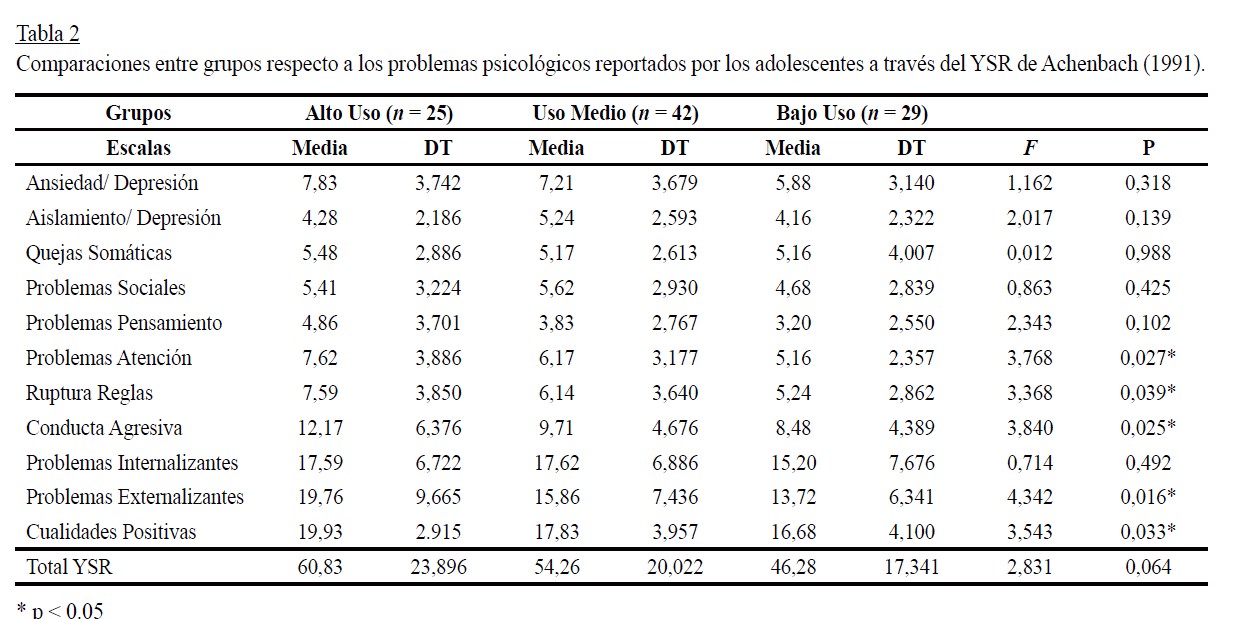Considerando la información aportada por los propios adolescentes a través de instrumentos de autoinforme, se hallaron diferencias significativas entre los tres grupos de participantes, divididos según el tiempo de uso de las redes sociales, respecto a diferentes problemas psicológicos. Así, los adolescentes con un Alto uso de redes sociales, aquellos que empleaban más de tres horas diarias en Internet, mostraban un nivel mayor de problemas externalizantes evaluados mediante el YSR, tanto en la escala global o de banda ancha, como en las escalas de conducta agresiva, ruptura de reglas y problemas de atención. Ese mayor nivel de problemas externalizantes se puede considerar coherente con otros estudios en los que se ha encontrado que los adolescentes que presentaron comportamiento agresivo tenían más probabilidades de usar Internet cada día, y más de 20 horas por semana (Ko et al., 2009). El uso de Internet se ha visto también asociado al trastorno por déficit de atención e hiperactividad (González & De la Rosa, 2007). Sin embargo, otros estudios muestran el uso de Internet como potenciador del área cognitiva, ya que lo consideran como un complejo gigantesco de red virtual de redes, que permite mejorar el desarrollo cognitivo y de este modo contribuir a procesos atencionales, puesto que las personas en la red desarrollan procesos de atención dividida o simultánea (Greenfield y Yan, 2006).