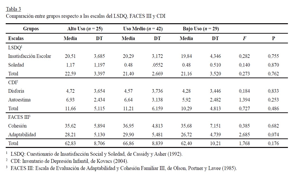 Otras variables analizadas fueron el rendimiento escolar medio, que fue de 1,96 (DT = 0,49) en una escala entre 0 y 3, para la totalidad de la muestra. No se encontraron diferencias significativas entre los grupos (F = 0,033, p = 0,967), ya que el rendimiento medio del grupo de Alto Uso fue de 1,96 (DT = 0,53), el de Uso Medio fue de 1,94 (DT = 0,43) y el de Uso Bajo fue de 1,91 (DT = 0,56).