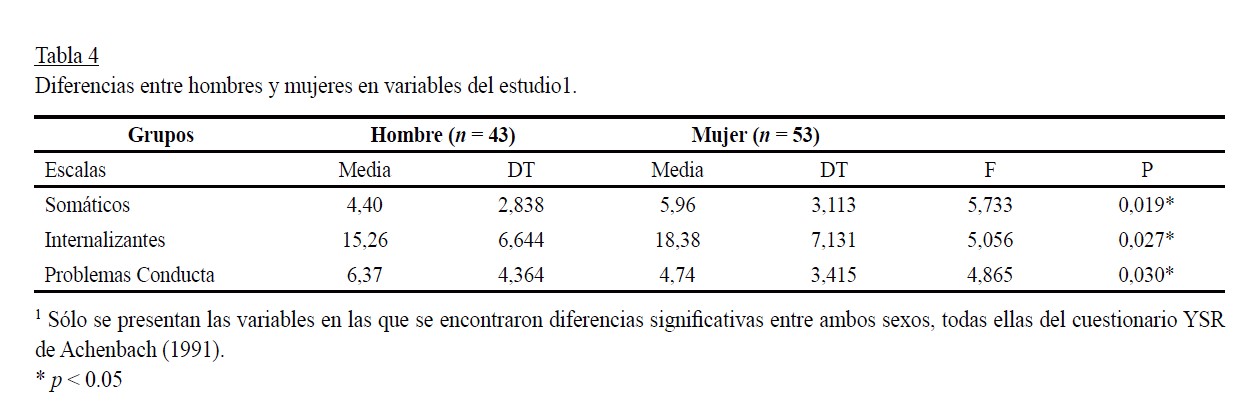 Finalmente, se valoraron las diferencias en función de la variable Sexo, sin que se hallaran diferencias significativas en función de esta variable para la mayoría de las variables estudiadas, salvo los problemas somáticos valorados en el YSR, así como en la escala de problemas internalizantes y problemas de conducta. Los resultados se muestran en la Tabla 4. En todos los casos la puntuación media del grupo de mujeres fue significativamente superior a la puntuación obtenida por los hombres, salvo en la escala de problemas de conducta. No hubo efectos de interacción entre las variables tipo de uso y sexo.