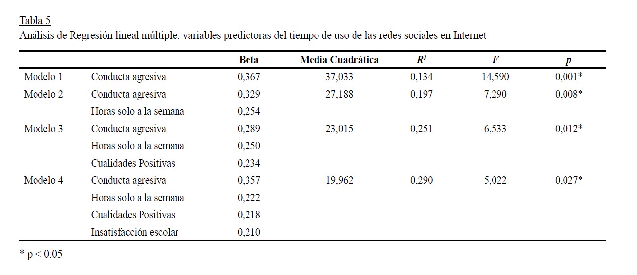 Por último, se realizó un análisis de regresión múltiple con todas las variables que podrían guardar una relación de tipo predictivo. Al finalizar el análisis se encontró que la conducta agresiva, las horas a la semana que permanecen solos, las cualidades y la insatisfacción escolar, predicen el tiempo de uso diario de las redes sociales en Internet, siendo la conducta agresiva la que guarda mayor poder predictivo respecto al tiempo que pasan los adolescentes en Internet en las redes sociales. En la Tabla 5 se recogen dichos resultados.