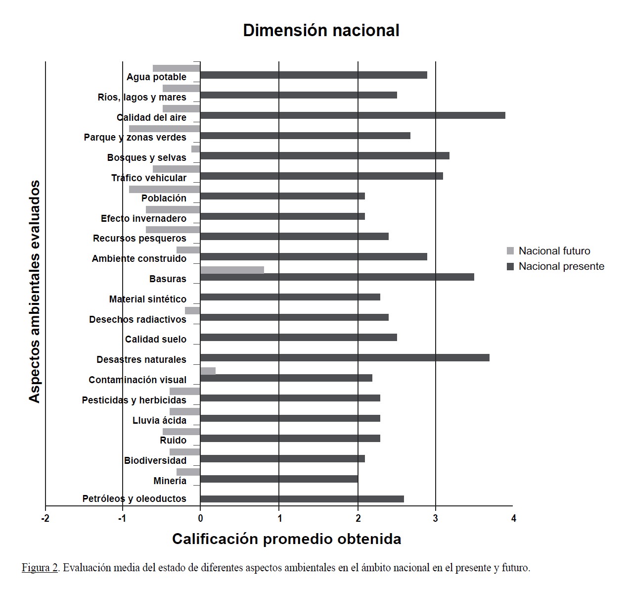 Presente. Para el ámbito nacional, los siguientes aspectos fueron evaluados como aceptables o buenos en el presente: calidad del aire, bosques y selvas, manejo del tráfico, basuras y desastres naturales. Los demás aspectos fueron calificados entre malos y aceptables, siendo particularmente los mayoritariamente calificados como malos: el control poblacional, el efecto invernadero, la contaminación visual, la biodiversidad y la minería (véase Figura 2).