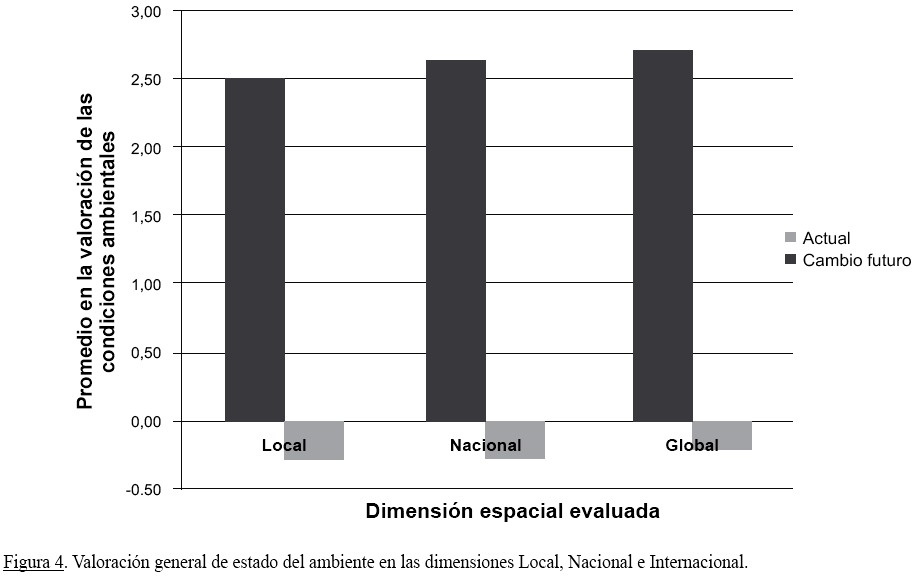Este análisis no muestra pesimismo ni optimismo en la medida en que no se observan diferencias significativas (p≤0,05) respecto del valor de cero, por lo cual se afirma que para los participantes colombianos el estado del ambiente en general no variará respecto a las condiciones locales, nacionales o globales en el futuro, aunque la valoración sí muestra un resultado negativo a nivel general sobre el estado futuro del ambiente (véase Tabla 2 y Figura 4).