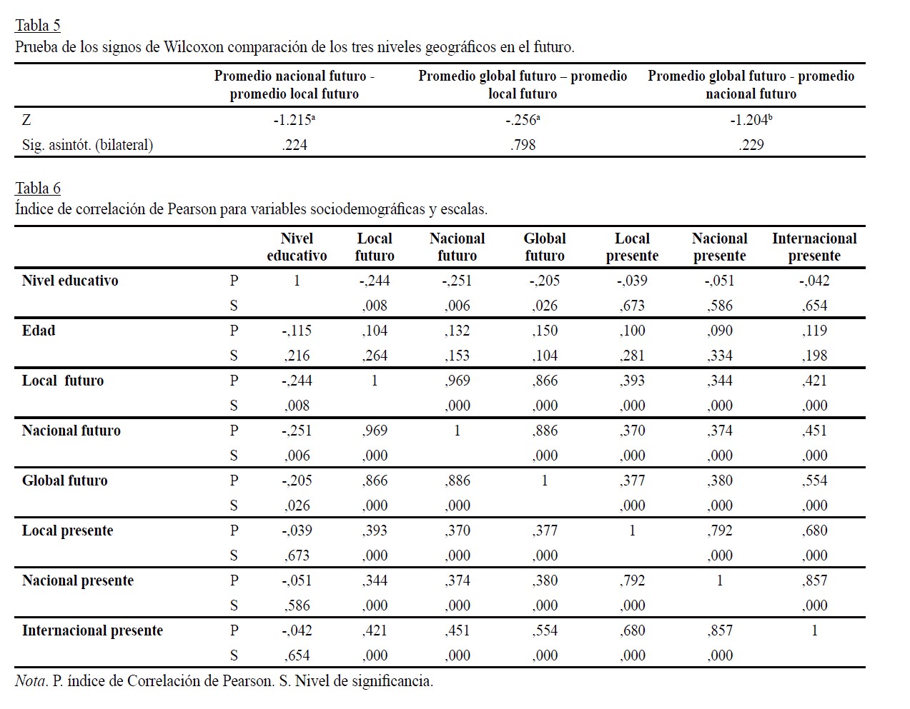 La evaluación general del estado ambiental Nacional Futuro presenta altas correlaciones positivas con la dimensión Global Futuro (,886, p ,000) y la dimensión Local Futuro (,996, p,000). La condición de evaluación del ambiente Local en el presente presenta altas correlaciones positivas con la dimensión nacional presente (,792, p,000) e internacional presente (.680, p ,000). La dimensión nacional presente también presenta alta correlación positiva con la evaluación internacional presente (.857, p, 000), identificándose con ello una fuerte correlación entre las dimensiones espaciales para el tiempo presente.
