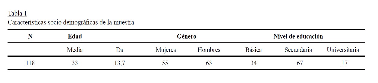 Tomaron parte de este estudio 118 habitantes de Bogotá, D.C. (Colombia), hombres y mujeres de distintos niveles de formación académica. La muestra fue seleccionada a partir de un muestreo no probabilístico, por conveniencia. El criterio de inclusión de la investigación fue: ser mayor de edad y haber vivido más de diez años en la ciudad. En la Tabla 1 se presentan las principales características sociodemográficas de la muestra de participantes.