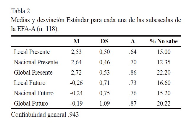 Escala de Futuros Ambientales EFA (Gifford et al. 2009). Se le incorporaron dos nuevos ítems: "manejo de la explotación de las minas" y "manejo de pozos petroleros y oleoductos" por considerar estos aspectos propios de la explotación de los recursos naturales del país. Así, el cuestionario quedó compuesto por 22 ítems que recogen los problemas más comunes del medio ambiente evaluados a partir de dos escalas, una espacial compuesta por tres dimensiones: local, nacional y mundial, y la otra temporal con dos dimensiones: a) condiciones presentes (muy malo=1, a muy bueno=5); y b) condiciones futuras (mucho peor = -2 a mucho mejor = 2). Se incluyó, además, la opción de respuesta "no sabe" para todas las escalas (véase anexo No.1). La confiabilidad del instrumento original fue de α = .97. La confiabilidad del instrumento original fue de α = .97.