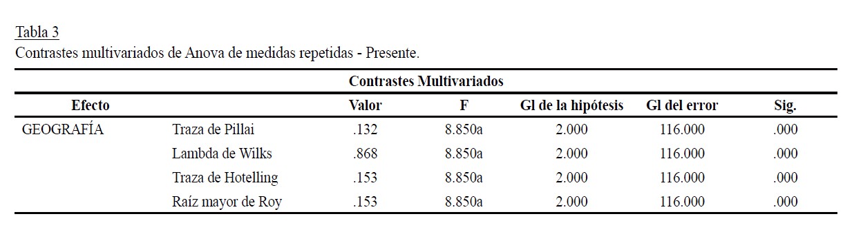 Análisis del optimismo espacial en el presente. Para permitir el contraste de los resultados con el estudio de Guilford et al., (2009), se llevó a cabo un análisis estadístico de estas evaluaciones a partir de un ANOVA, al igual que en dicho estudio. El análisis muestra evidencias significativas en las evaluaciones sobre el estado del ambiente para las tres dimensiones espaciales indagadas. En la Tabla 3 se presentan los diferentes contrastes estadísticos para la comparación de Optimismo y Dimensión Espacial.