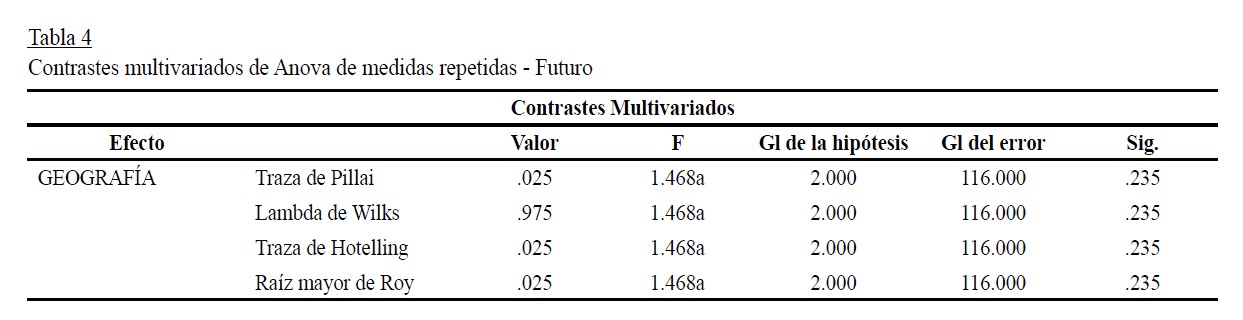 El análisis estadístico de la medida de optimismo para el estado ambiental en el futuro en las tres dimensiones espaciales, local, nacional e internacional, no evidencia diferencias significativas. En la Tabla 4 se presentan los diferentes contrastes estadísticos para la comparación de Optimismo sobre el estado del ambiente y Dimensión Espacial.