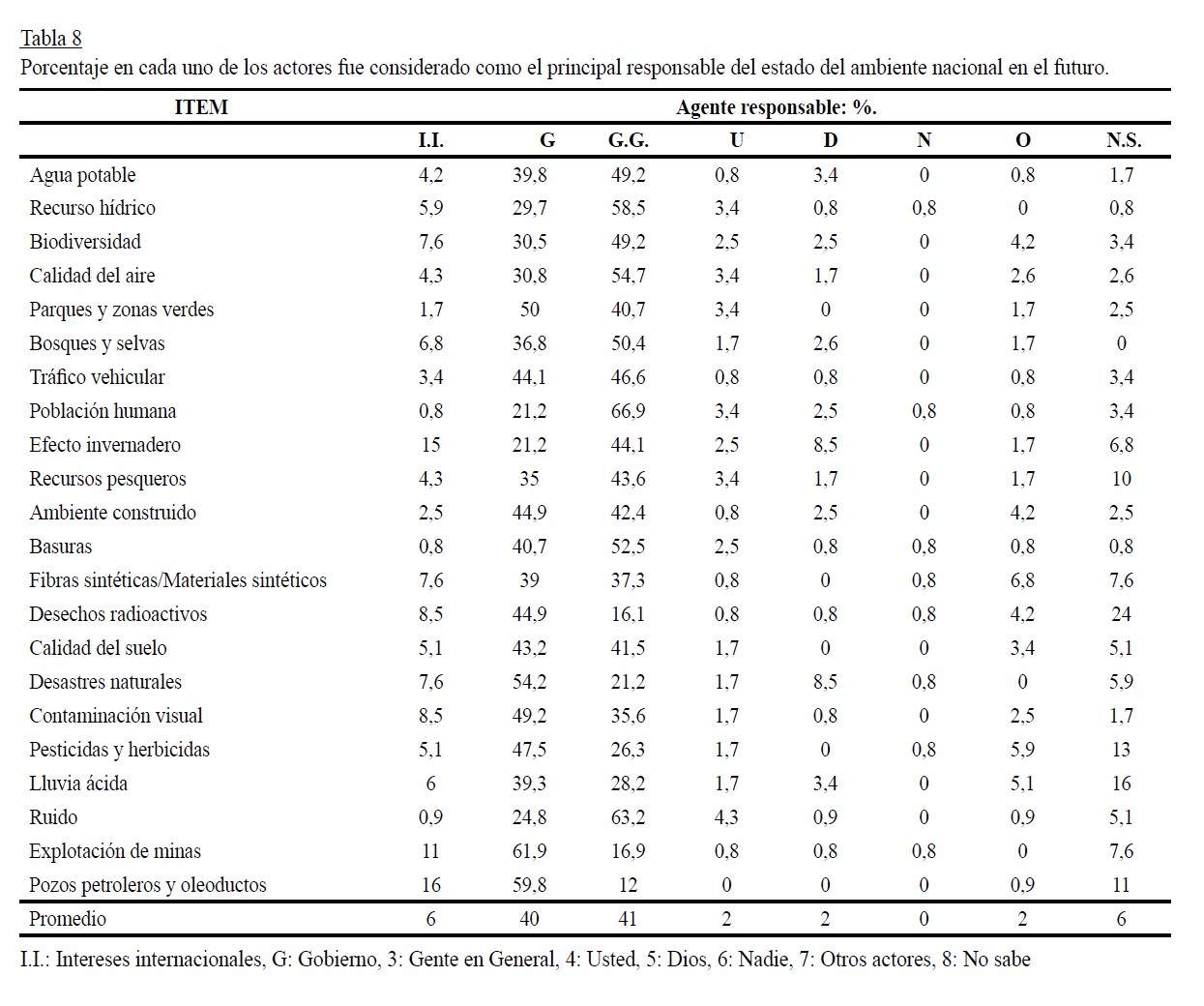 Dimensión nacional. Para la evaluación de la atribución de responsabilidad de los agentes que afectan el medio ambiente en la esfera nacional (ver Tabla 8), los dos factores que agrupan el mayor porcentaje de responsabilidad de acuerdo con los participantes son las otras personas y el gobierno; en promedio agrupan el 81% de la atribución de responsabilidad. Los agentes que se considera afectan menos el estado del ambiente como en la dimensión anterior son: la voluntad de Dios (en promedio 2%) y la persona que diligencia la encuesta (2%).
