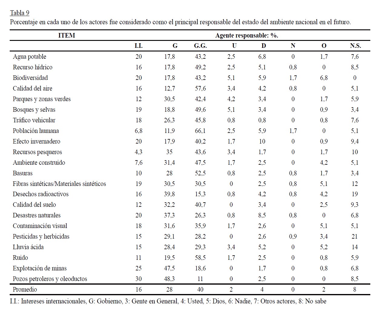 Dimensión global. Para la evaluación de la atribución de responsabilidad de los agentes que afectan el medio ambiente en la esfera global (véase Tabla 9), los dos factores que agrupan el mayor porcentaje de responsabilidad de acuerdo con los participantes son igualmente: las otras personas, el gobierno, y los intereses internacionales, agrupando el 81% de la atribución de responsabilidad. Los agentes que se considera menos afectan el estado del ambiente son de nuevo: la voluntad de Dios (en promedio 2%) y la persona que diligencia la encuesta (2%).
